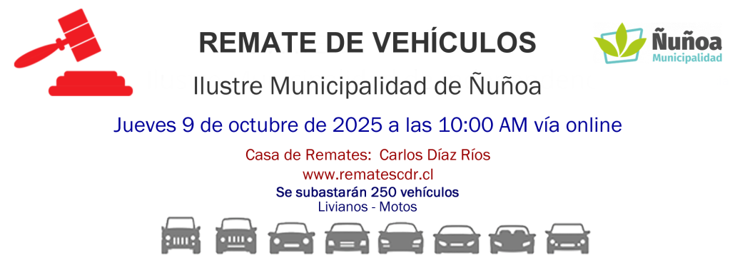 Municipalidad de Ñuñoa Jueves 9 de octubre de 2025 a las 10:00 AM vía online Casa de Remates: Carlos Díaz Ríos www.rematescdr.cl 250 vehículos (livianos y motos)