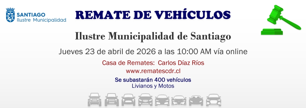Municipalidad de Santiago Jueves 23 de abril de 2026 a las 10:00 AM vía online Casa de Remates: Carlos Díaz Rios www.rematescdr.cl 400 vehículos (livianos y motos)
